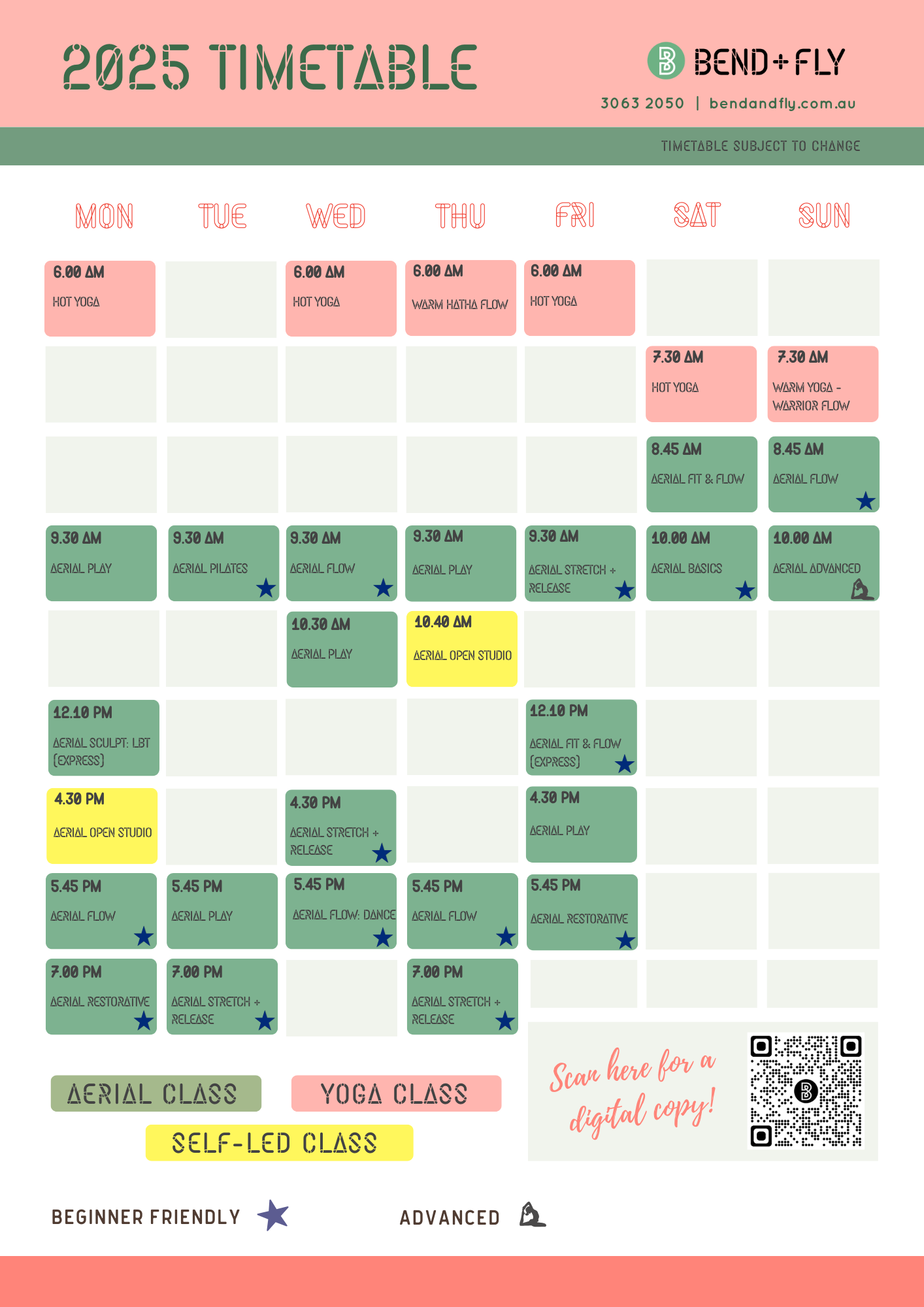 If you have never done aerial before, you’ll need to start with a beginner friendly class marked with a ☆. If doing yoga for the first time, you can start with any class, but classes marked with a ☆ are great starting classes.